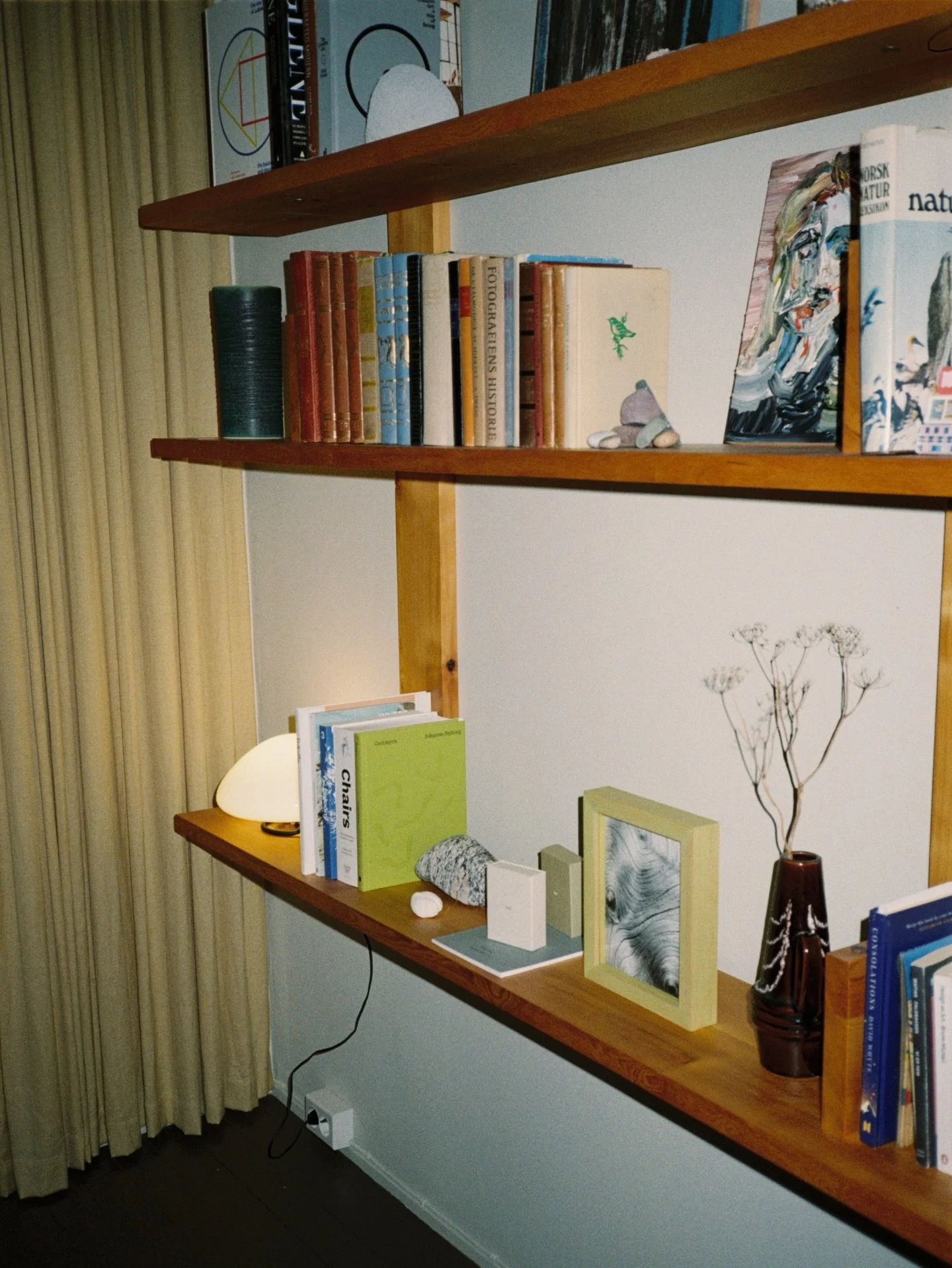 There are two bedrooms in the house, each with its own quiet charm. Upstairs, the bedroom feels especially welcoming, with oak wardrobes made to fit the space, painted wooden floors, and an east-facing window where the morning sun filters through the window and bathes the room in a soft golden light.